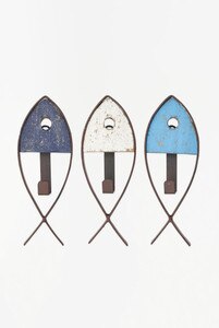 D2014 - Fish w/ Wall Hook, Wood & Metal, Blue, L: 7" - H: 6.6" Set 3 (x2)
