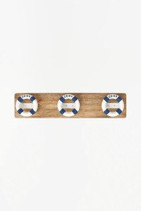 D7477 - 3 Lifesaver Hooks on Plaque, Wood & Metal, Blue/White, L : 17.7" - H : 3.9"