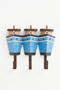D7615 - Wooden Boats w/ 3 Coat Hooks, Blue, Metal/Wood, L: 11" - H: 9.8"