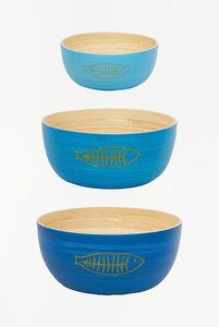 D2328 - Fish Sketch Bowls, Bamboo, Blues, D: 6.2" - H: 2.7", D: 8.6" - H: 3.9", D: 11" - H: 5.1" SET/3